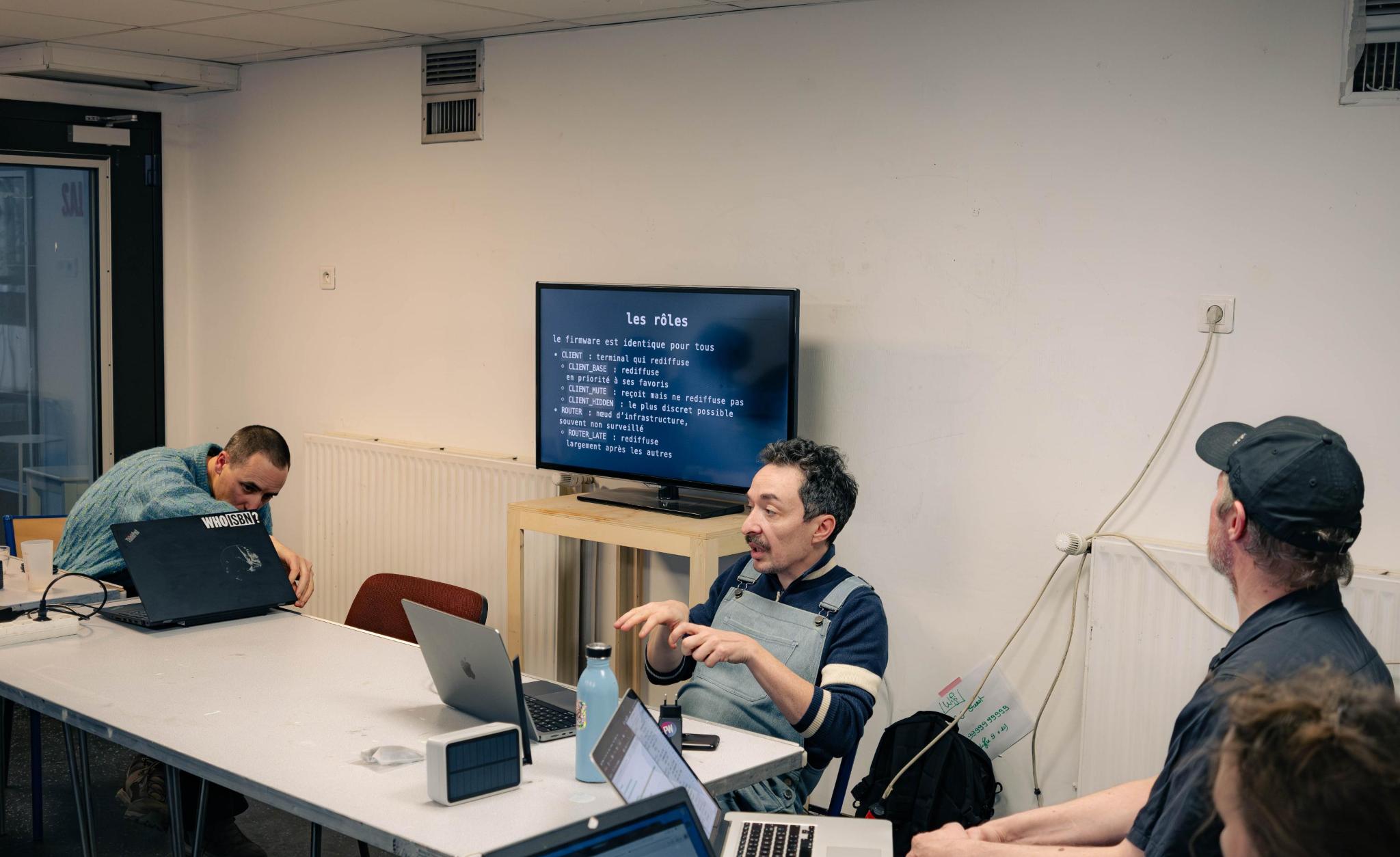 The day's program included demonstrations of equipment and communications, discussions about potential uses, network structure, the importance of setting up relays, and, above all, what creative spaces are possible on this specific network. See Joachim Robert's notes on equipment testing.